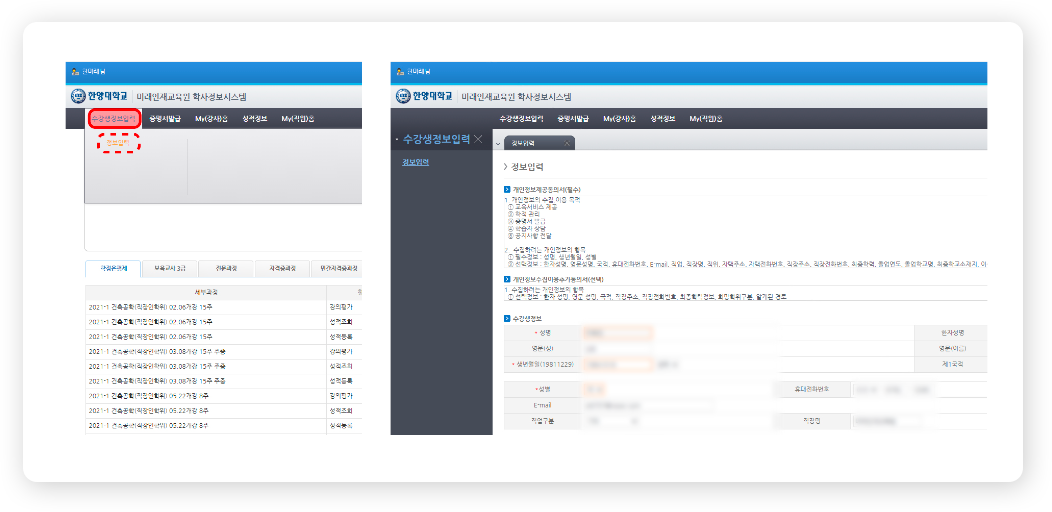 재 로그인 하여 ▶ [수강생정보입력] - [정보입력] 메뉴를 클릭하여 정보 입력
