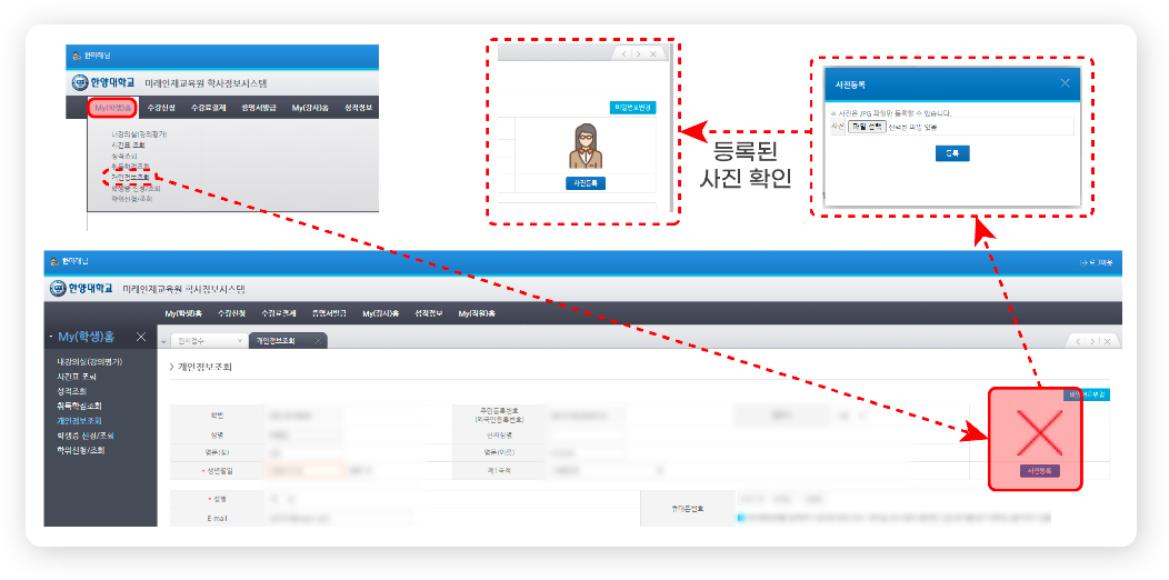 5 [My(학생)홈] - [개인정보조회] 메뉴에서 [사진등록] 클릭 후 팝업창에서 사진등록 (원서접수 시 반드시 사진 업로드 필요)