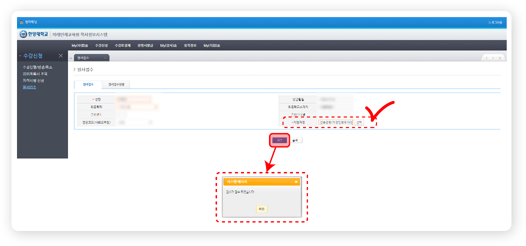7 원서접수 내용을 다시 확인 (지원과정 반드시 확인)한 후 접수 클릭 ▶ 시스템메시지 확인
