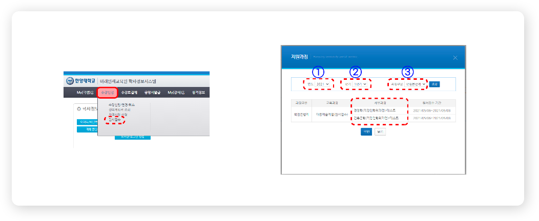 6 [수강신청] - [원서접수] 클릭 후 [지원과정] 팝업창에서 지원하고자 하는 ①연도, ②학기를 선택하고