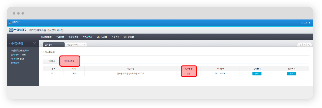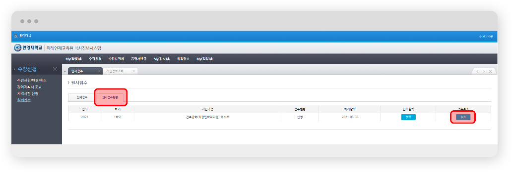 [원서접수현황] 탭에서 [취소] 클릭 시 접수취소 가능